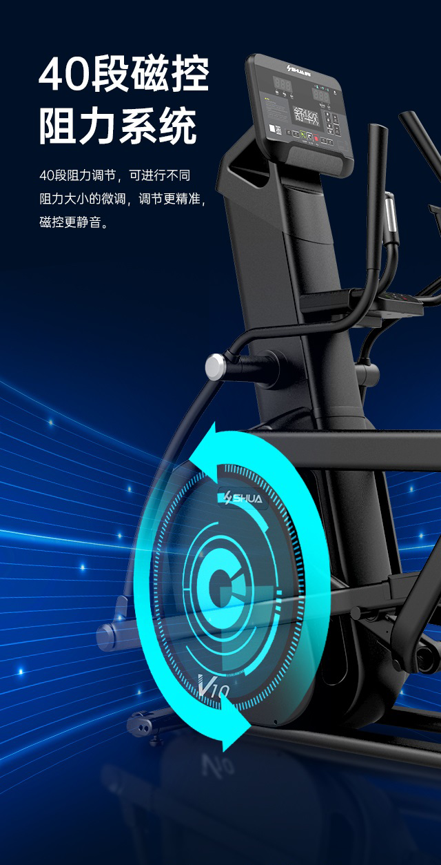 舒华商用椭圆机SH-B9100E(触屏版)采用电磁控系统的阻力系统,具有40段电磁控阻力系统,运用手握心率片侦测心率,9.3公斤飞轮质量。
