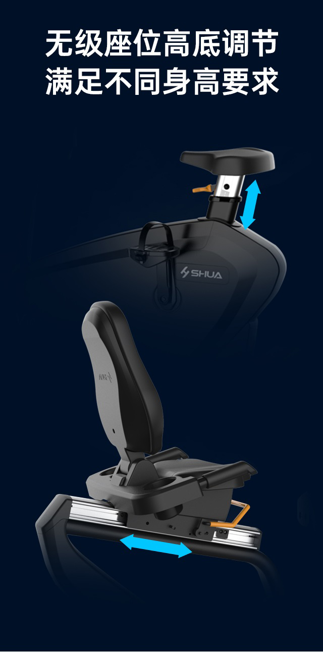 舒华卧式商用健身车SH-B9100U(V10)采用自发电,40段电磁控阻力系统,9.3kg飞轮重量。